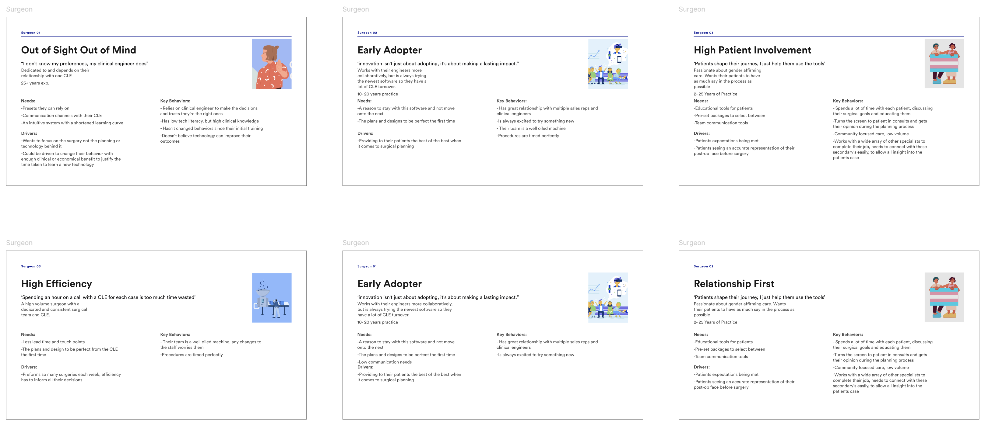 To tailor our solution to surgeons' needs, I suggested developing detailed personas. These personas helped us understand their specific needs, pain points, and goals, ensuring our design addressed the most critical aspects of their workflow.