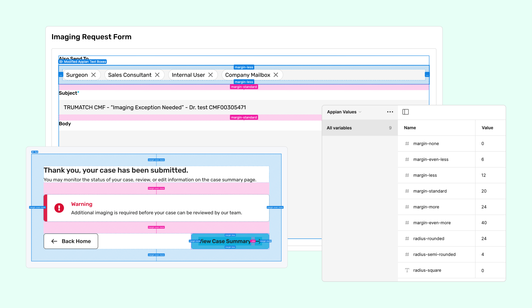 Appian's limited flexibility required us to use predefined variables for elements like border radii, padding, and margins. To bridge the gap between our Figma designs and Appian’s constraints, I built these predefined values into Figma. For example, Appian's border radii options included square (about 0px), semi-rounded (about 2px), and rounded (about 4px), while margins were defined as "more" (about 24px), "even more" (about 56px), and standard (about 20px). By incorporating these variables into our Figma designs, we ensured that developers could easily translate our exact pixel specifications into Appian’s predefined values, maintaining design consistency and reducing the need for guesswork.
