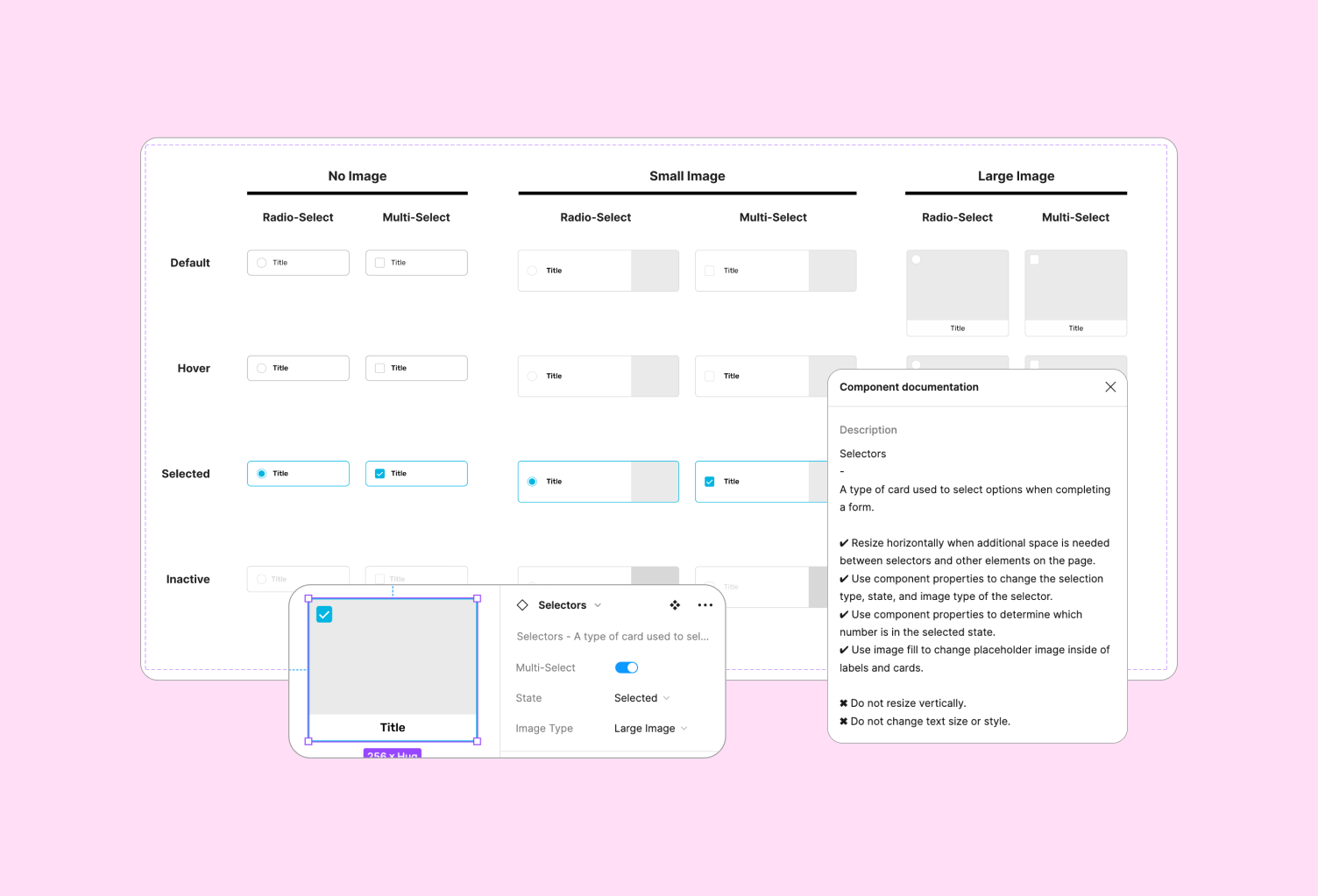 With a clear understanding of the inconsistencies and the DPS design standards, I proceeded to create a cohesive design system for our project. This involved integrating parts of the previous design toolkit and pre-built Appian (the low-code platform our developers were using) components to build the foundation of our design system. I adapted and converted some components from the Appian design system to align with our DPS design system, modifying colors, formats, drop shadows, and outlines to match the DPS toolkit. I also developed custom components (such as the selectors shown below), ensuring adaptability for both mobile and desktop modes using auto layout and variant properties.